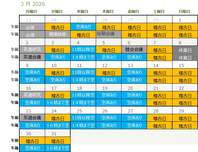 ※お稽古日(色セル)でも予約が可能な場合があります。